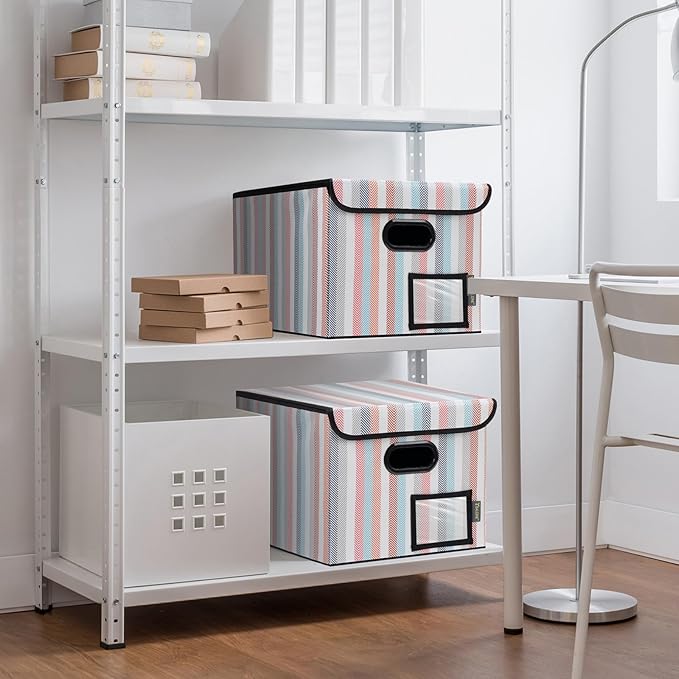 BALEINE File Organizer Box with Lid, Collapsible File Folder Organizer with Plastic Slide, Hanging File Folder Box for Office Document Storage (2 Pack, Color Stripe)