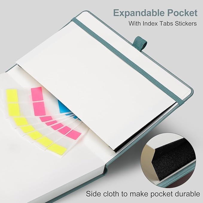 - CONVENIENT AND PRACTICAL LAYOUT: Features a pen holder for easy access to your pen, an elastic band to keep your notebook securely closed, 2 bookmarks for quick page referencing, an inner pocket for storing loose papers, and 18pcs sticky notes for additional organization and reminders