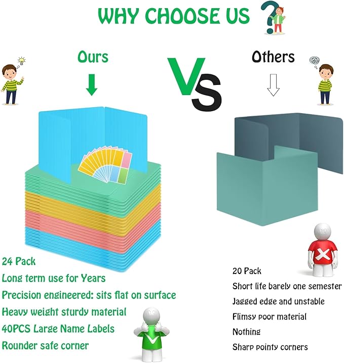 - Charming & Mighty - Unlike flimsy, cheaper plain plastic and cardboard desk dividers for students, our testing dividers for classroom create an uplifting space. Durable, eco-friendly pure plastic.