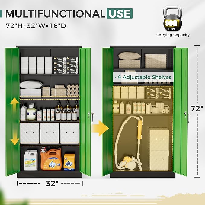 - [Big Size & Large Storage]:Greenvelly (72”)steel storage cabinets have a popular size (72*32*16),and each one has four adjustable shelves inside, which can be adjusted according to the height and size of the storage goods. This lockable storage cabinet is suit for many scenes,such as garage,home,office,school,etc.