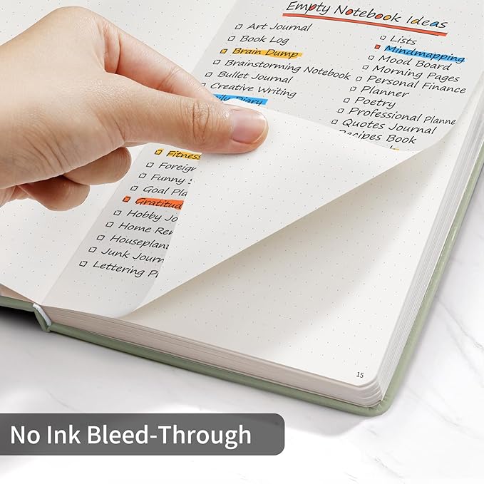 - Multifunctional Cover: The hard cover is made of vegan leather, and designed with a pen loop, an elastic band, two ribbon page markers, an expandable inner pocket.
