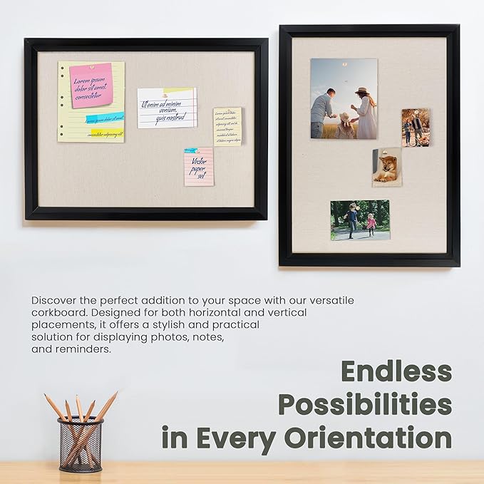 - Premium Solid Wood Frame: Cork board with a solid wood frame measuring 1.38" in width. This sturdy construction ensures durability and longevity, providing a reliable display solution for your photos, notes, and reminders. Its elegant design adds a touch of sophistication to any space, making it a versatile and stylish addition to your home or office decor.