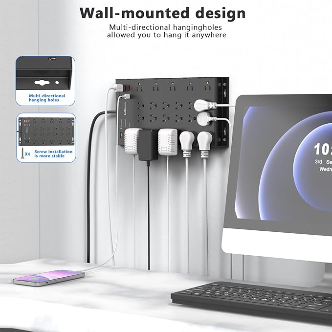 - 【Wall Mountable Design & 45° Flat Plug】The back of the big power strip is designed with 4 multi-directional suspension holes (with 4 rigid screws), which can be firmly installed horizontally or vertically on walls, counters, or other furniture, without taking up valuable space, allowing you to enjoy the use of clean electrical equipment. And the 6.5ft-long Heavy Duty extension cord have a 45-degree flat plug, which makes better use of space and doesn't block other plugs, making you more comfortable.
