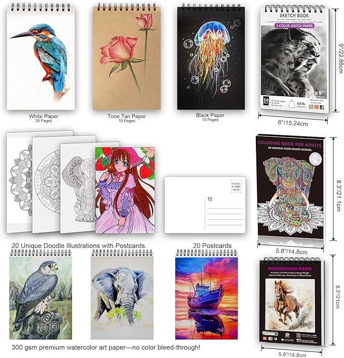 - 【Unique 3-Color Sketchbook,Coloring Book and Watercolor Book 】6 x 9", 100GSM, 50 Pages (30 pages white, 10 pages toned tan, 10 pages black) - Different colors of sketch paper are suitable for different styles of drawing.A5 coloring book,160GSM,20 unique doodle illustrations,premium paper accepts a variety of coloring tools.Each illustration also is a postcard that can be mailed anywhere as long as it is stamped.A5 watercolor book,300GSM,12 Pages.They absorb water well, are excellent for blending, and leave clean lines with no bleed-through.Acid-free non-color fading sheets for use in both wet and dry media.