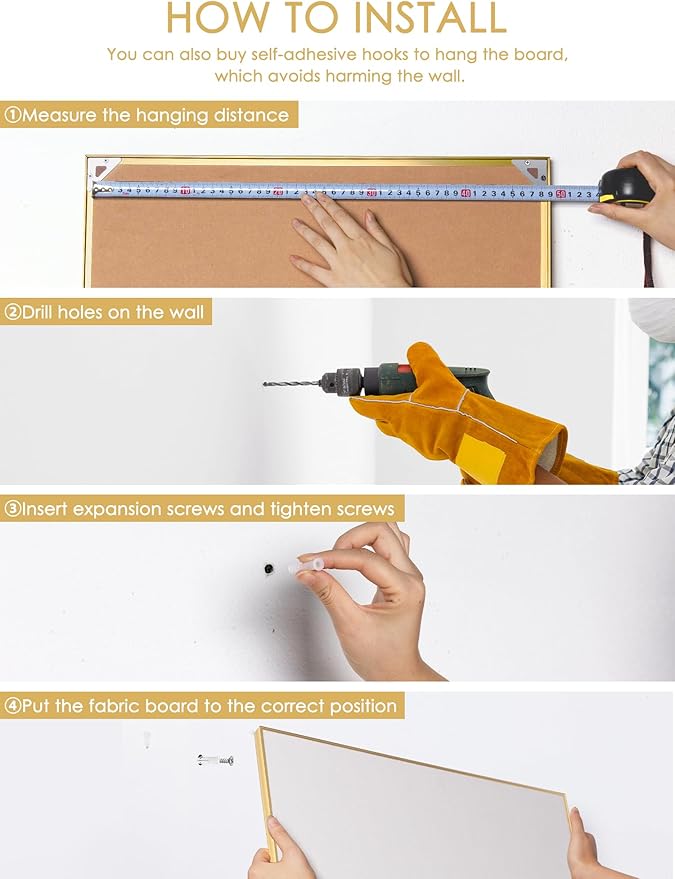 - Classic Cork Message Board: Crafted with a sleek golden aluminum frame, a high-density fabric top layer, and a sturdy 7-layer corrugated paper backing, this inspiration board ensures exceptional durability and longevity.