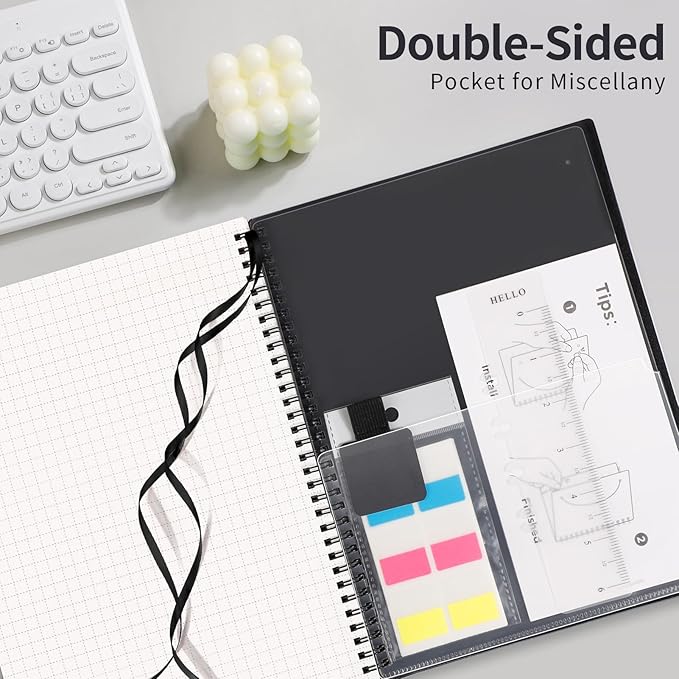 - PRACTICAL LAYOUT: Equipped an elastic band, a self-adhesive pen holder and removable bookmark ruler to keep your notebook organized. Comes with a DIY bookmark with a ribbon for self-attachment to the spiral, serving as a bookmark. Features a double-sided pocket for storing miscellany and 18pcs sticky notes for additional organization and reminders