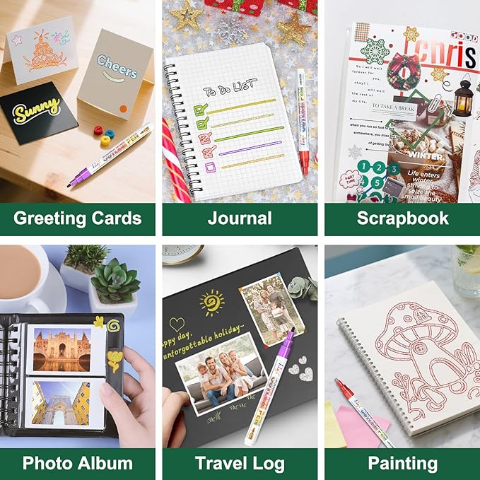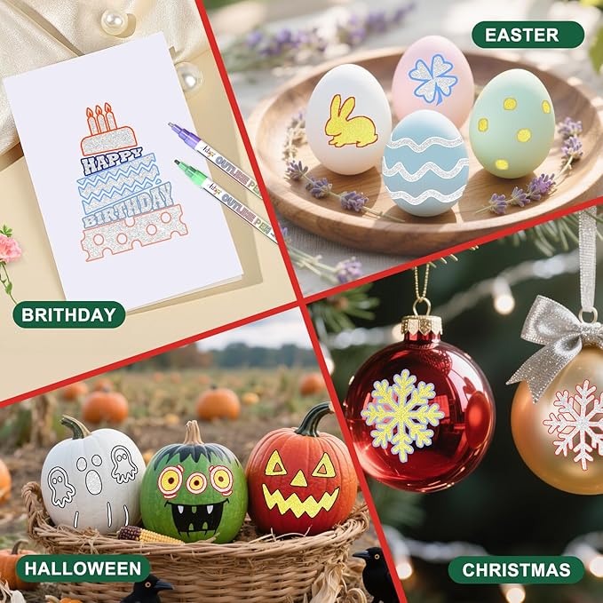 - 【Widely Used】These sparkly outline pens set are suitable for DIY crafts such as Christmas gifts card, easter basket stuffers, wedding invitation cards, photo album, guest book, scrapbooking, envelopes, gift boxes,and creating birthday cards. Besides, they are suitable for various surfaces such as rock, stone, glass, wood, metallic, ceramic, etc. This 18 glitter outline markers add a sparkling embellishment to various crafts.