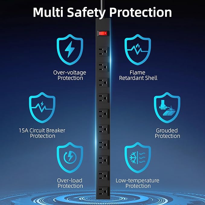 - ✅OVERLOAD PROTECTION:A power switch with lighting has a built-in high quality 15A circuit breaker for overload protection. When the operating current exceeds the rated current, this power strip automatically cuts off the power supply from spikes, fires or other unsafe conditions.
