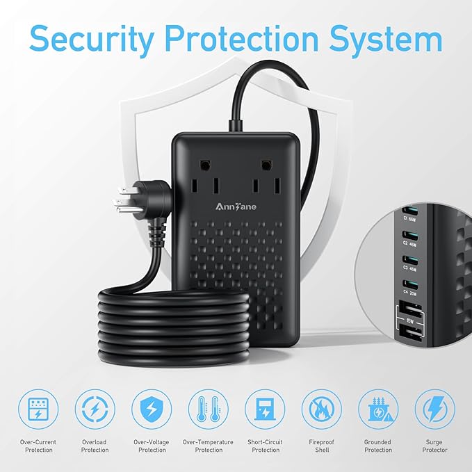 - 【8 in 1 Charging Station】This usb c charger with 4 USB-C ports (1 x 65W, 2 x 45W, 1 x 20W), 2 USB-A ports (2 x 15W) and 2 AC power outlets. It is charging station for multiple devices that can power up to 8 devices at the same time.