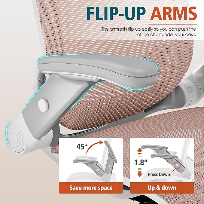 - 【ADJUSTABLE FLIP-UP ARMS】-If you want to make the most of the space under the table or choose a home desk chair for a small space/bedroom, this is the office chair for you! The GABRYLLY ergonomic office mesh chairs' armrest can be folded up(45°) and be adjusted the arms' height(1.8'').