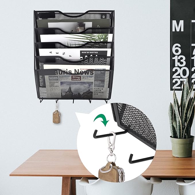 EASEPRES 5 Pocket Mesh Hanging File Organizer with Key Holder Hooks & Nametag Label, Wall Mounted Mail Paper Document Folder Storage Organization Magazine Rack for Office Cubicle, 5 Tier Black