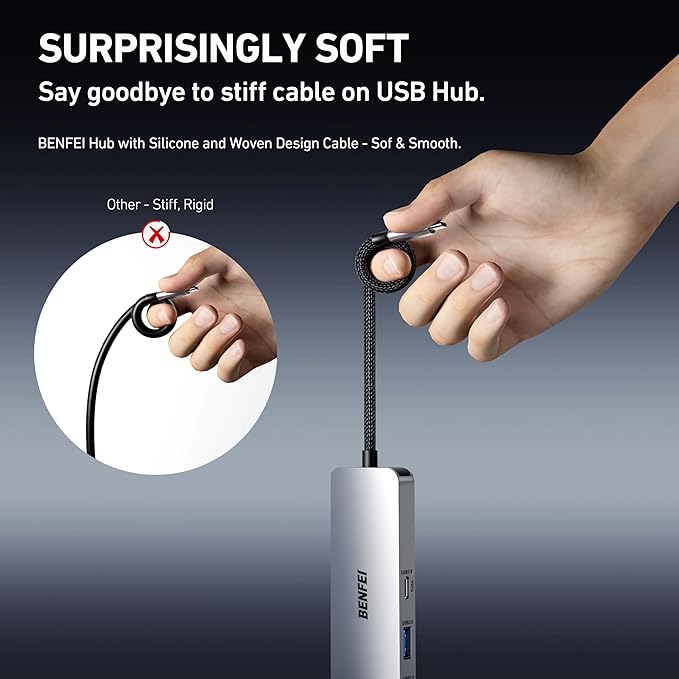 - 【Design centered on comfort and reliability】Thanks to BENFEI's end-to-end in-house cable production capability, in-house PCBA and assembly capability, using the industry's most advanced silicone woven design and process, 20cm cable in length, no knots, super-soft, the HUB is easy to use in all scenarios: laptop, tablet, stand etc. Super-soft, 25000+ life cycles, to meet your daily carrying and office needs.