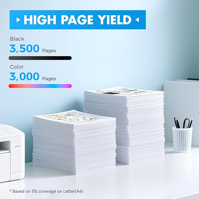 - 【Page Yield】Up to Black is 3,500 pages per black cartridge and Color is 3,000 Pages per color cartridge (Letter/A4, at 5% Coverage).