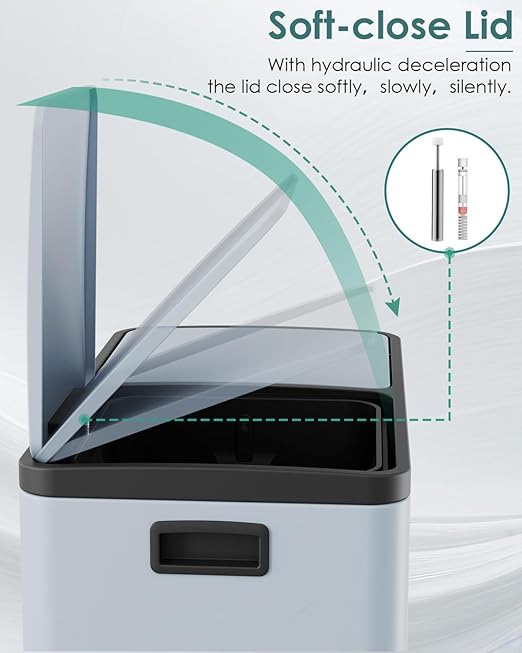 - GENTLE&SEALED LIDS: 60L trash lid is designed with ABS hydraulic deceleration to close gently and silently, minimizing noise and preventing it from slamming shut. Sealed lids fit tightly to block unpleasant odors, keeps your home smelling fresh and clean.