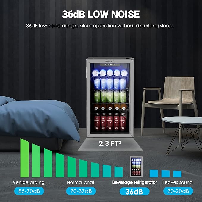 - Compact Design - This is a 3.2 cuft capacity beverage refrigerator, it can hold up to 130 cans of beer, the mini fridge for bedroom also comes with 4 removable shelves that can be inserted in 8 slots at will to meet the personalised needs of placing different sizes of drinks