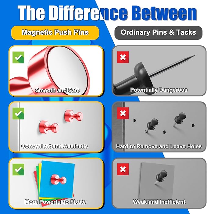 - DURABLE CONSTRUCTION: Crafted from neodymium with triple-layer coating, these fridge magnets are designed to last. Push pins magnets resist corrosion and scratches for longer-lasting performance in daily use