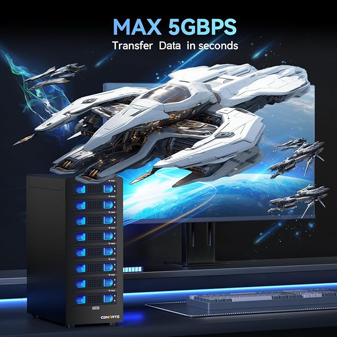 - 【Up to 5Gbps】This 8 bay enclosure equips with VL162+VL822-Q7+JMS567+JMB575 chip and USB C 3.0 output interface, Max 5Gbps under UASP control.Transfer 1G movie in 3-5 seconds with USB 3.0 Ports, which is 10 times faster than USB 2.0.