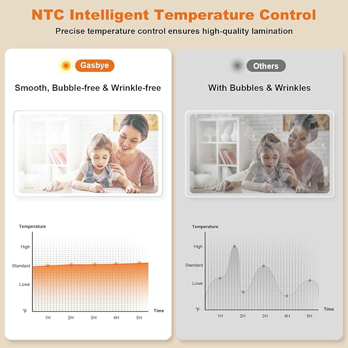 - [100% Anti-Jam Design] The Gasbye home laminator features an upgraded anti-rolling film structure, effectively preventing paper jams and ensuring smooth lamination and optimal protection for documents, photos, DIY artwork, and more