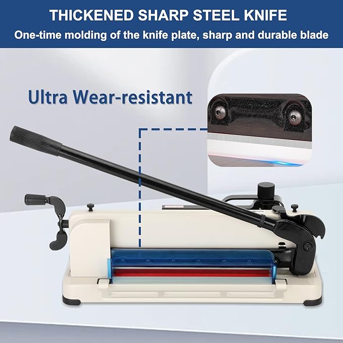 - [Thick and Sharp Steel Knife]This paper cutter guillotine style is equipped with a thickened sharp steel knife with wear-resistant and durable blades that can easily cut a wide range of materials to meet your heavy-duty cutting needs