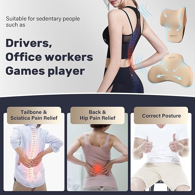 Coverado Lumbar Support and Car Neck Pillow, Ergonomic Memory Foam Desk Chair Cushion and Headrest Pillow for Car Office Chair, Sciatica & Neck & Tailbone Pain Relief Cushion-Beige