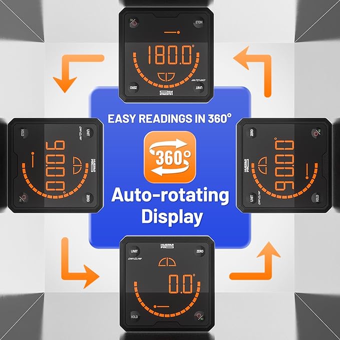 - 【Magnetic V-grooves & Reversible Display】The digital bevel gauge features a powerful magnetic V-groove base, allowing it to securely attach to any magnetic surface, such as miter saws, band saws, table saw blades, and metal poles. The V-groove edges on all four sides easily fit around round surfaces, making marking and measuring a breeze. Plus, the reversible contrast display makes it easy to read from any direction, whether you're on a job site, in your workshop, or at home