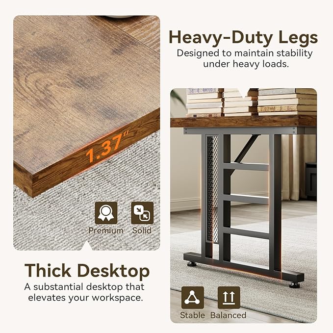 - 【Heavy-Duty, Sturdy Desk Frame for Durability】Built with a 1.37-inch thick engineered wood surface, this desk offers exceptional strength. The reinforced steel frame supports multiple monitors, printers, or heavy equipment. Adjustable leg pads keep your desk steady on uneven floors, ideal for home or writing desks.