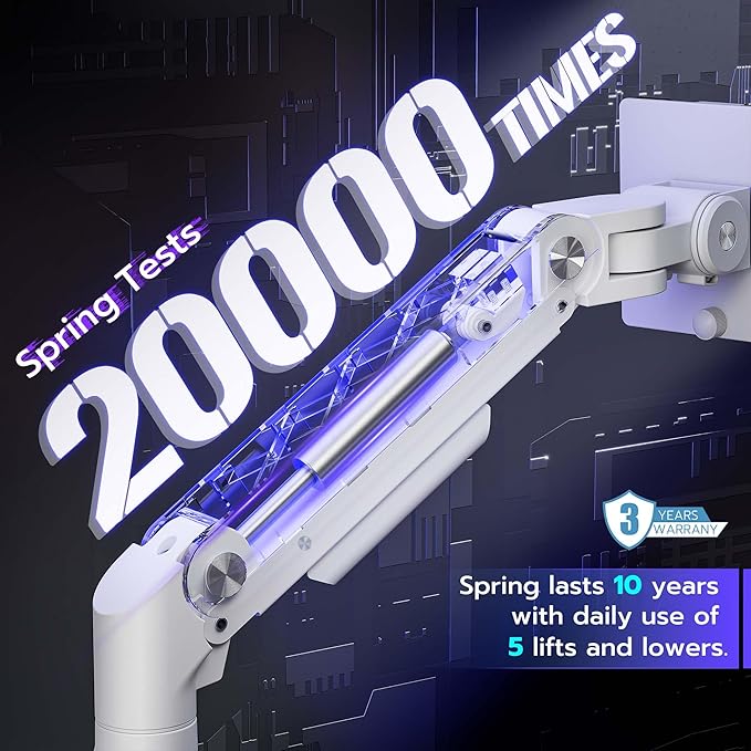 - 【Durable and Reliable】Our dual monitor desk mount is designed with strength and longevity in mind, manufactured using premium-grade steel and aluminum. To ensure its resilience and flawless functionality, the internal gas spring has undergone 20000+ rigorous fatigue testing
