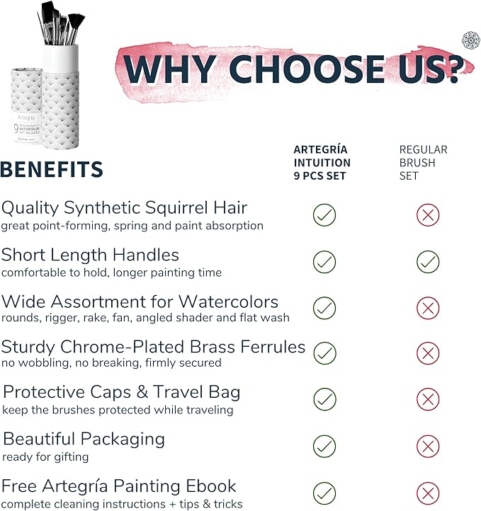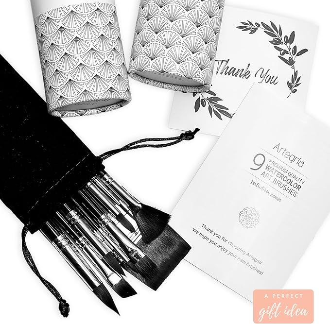 ARTEGRIA Watercolor Brush Set, 9 Professional Soft Synthetic Squirrel Paint Brushes, Including Round Detailers, Flat Wash, Rigger, Rake, Fan, Angled Shader