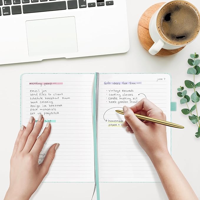- 180° LAY-FLAT DESIGN: The lay-flat design allows for easy writing and ensures that you can utilize every page efficiently. Journaling, note-taking and planning has never been easier. 2 Bookmarks help you find important content faster.