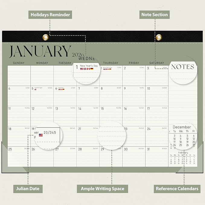 - [2025-2026 DESK CALENDAR] – Running until to December 2026, the desk calendar highlights holidays and Julian dates to keep you on track. Each month features two reference calendars for easy review of past and upcoming dates—perfect for managing long-term projects, school schedules, and work plans.