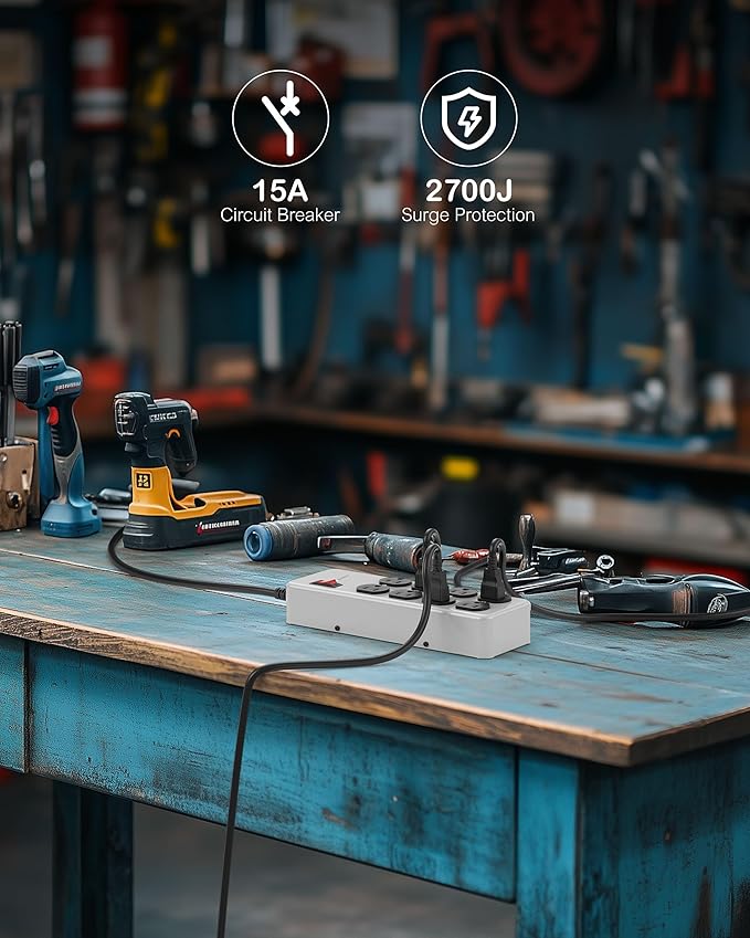 - High Capacity Powering: Equipped with 8 AC Outlets, this tool power strip surge protector has an electrical rating of 15A 125V 60Hz 1875W, combined with a 6ft 14AWG Heavy Duty Power Cord. It's the ultimate solution for all your power needs in heavy-duty settings, embodying the essence of a shop power strip heavy duty 15 amp.