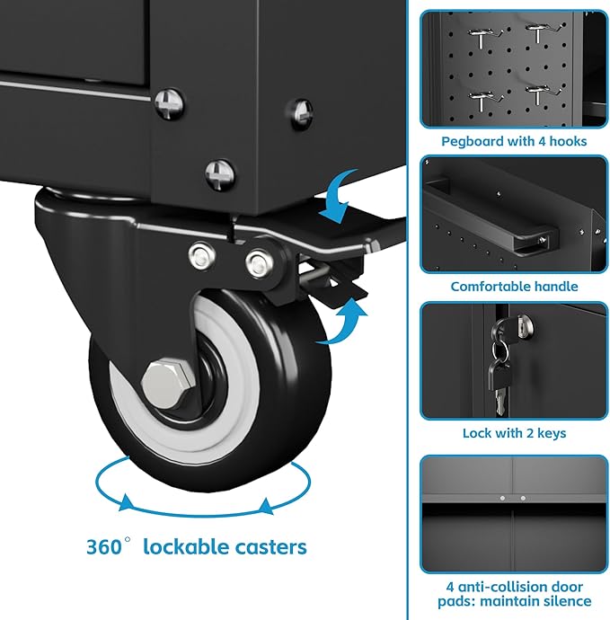 - [Effortless Mobility] Featuring 360° swivel silent casters with lockable rubber wheels, our metal storage cabinet moves easily without damaging your floors.