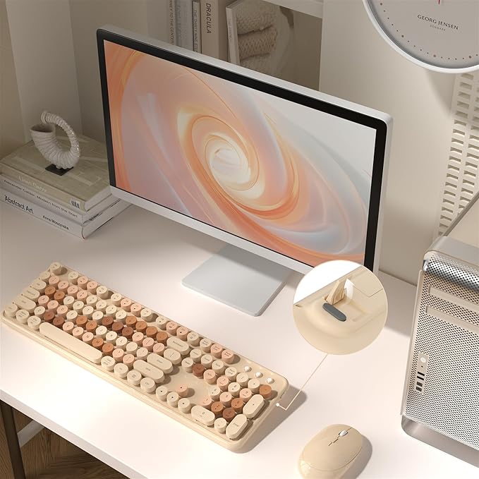 Colorful Wireless Computer Keyboard and Mouse Combo with Round Typewriter Keycaps, Retro Design, Power Switch, Ergonomic Design, 2.4GHz Wireless for Windows, Mac, PC(Milk-Tea Colorful)