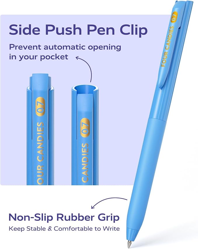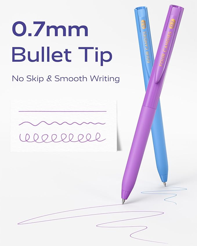 - QUICK DRYING PENS: Say goodbye to smudges with Four Candies fast-drying 0.7mm pens colorful. The smooth ink flow ensures a seamless writing experience, while the quick-drying ink prevents smudging—ideal for left-handed writers who often face this issue. Note: The sealing wax needs to be removed before writing