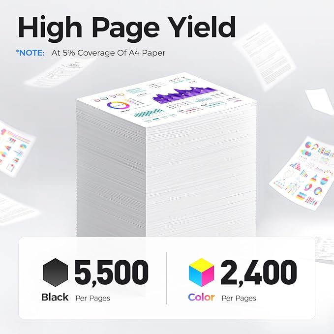 - Extra High Yield: up to 5,500 pages per 6510/6515 Black and 2,400 pages per 6510/6515 Color (Total 12,700 pages, 5% coverage).