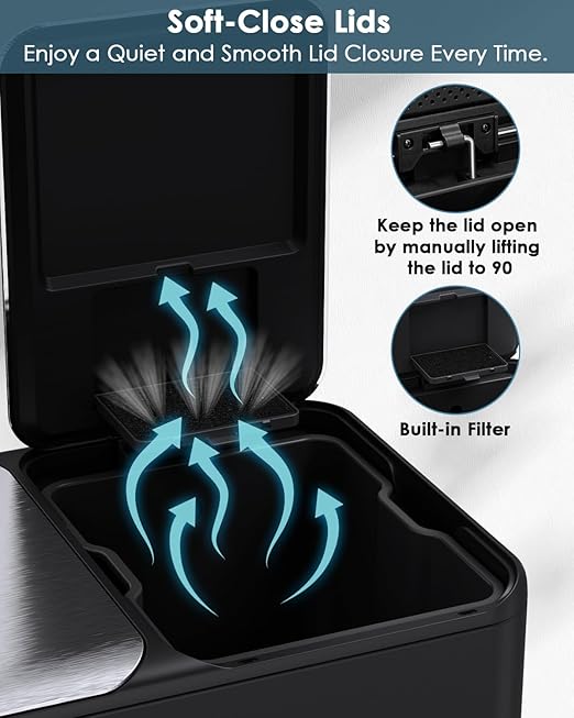 - Built-in Box for Odor Control: Dual trash combo is perfect for the kitchen. Both lids are equipped with built-in box for storaging cleaning material for helping to improve the air quality around the trash can. Enjoy a clean and pleasant environment.