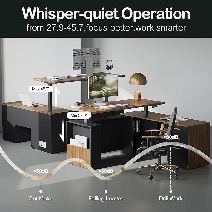 - Perfect Workstation: This executive standing desk provides a solution for your ergonomic office and multiple storage needs. This stand up desk can be adjusted from 27.9“ to 45.7” which you can choose any comfortable height to work at. It also has memory buttons so you can set your usual sitting and standing office heights. There are sockets on the table for you to charge at any time