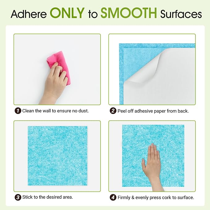 - Strong Self Adhesive Backing: 12 "x12" small cork tile easy mounting to create custom bulletin boards, adhesive works perfectly on flat, textureless, dust-free, dry surfaces, a perfect solution to pin your notes and messages in any commercial environment
