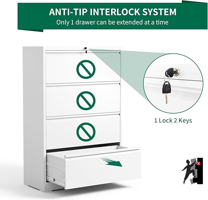 - 【Locking Cabinet for Security】This 4 drawer file cabinet with lock has an anti-tip design, which ensures that only one drawer can be opened at a time, preventing tipping and protecting your safety. The upgraded interlock system with 1 lock and 2 keys keeps your important documents safe.