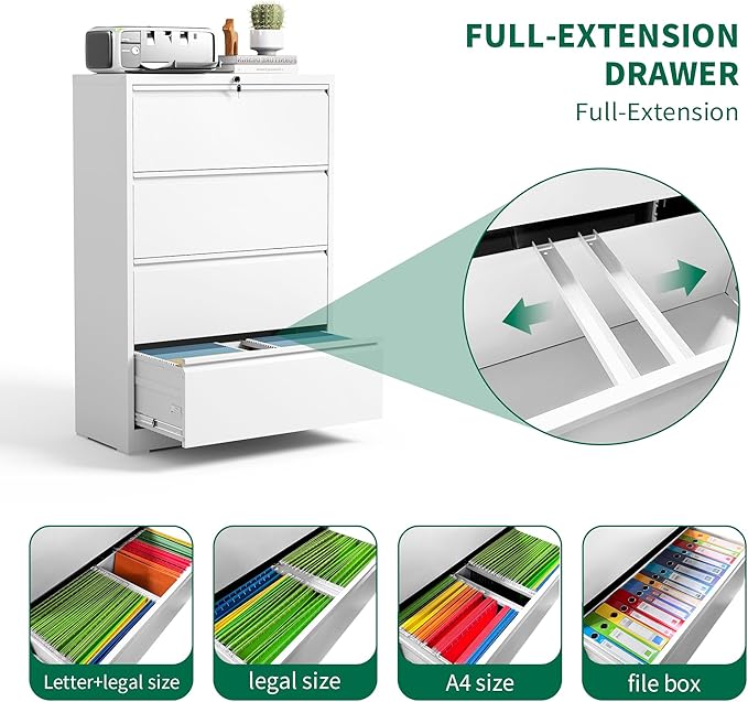 - 【Large Storage Space】Large 4 drawer lateral file cabinets have deep and spacious drawers, which can hold Letter, Legal, A4 and F4 size file folders. The adjustable hanging bars allow you to customize the drawers to your specific needs, keeping your files organized and easy to access.