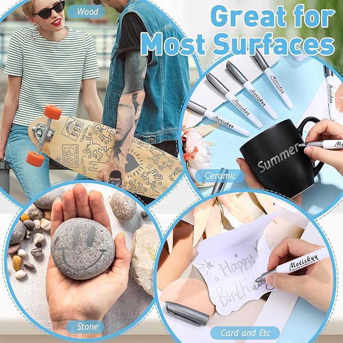 - Multi-surface Use: the metallic paint marker can be written on most light and dark surfaces, such as black card paper or greeting cards, wood, walls, canvas, stone, glass, metal, plastic, ceramics, gift bags, etc., which is a good helper for DIY, marking or painting, etc