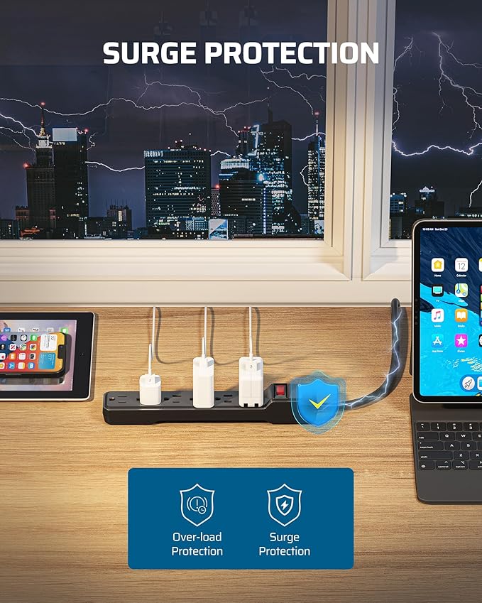 - [Superior Safety] UL Listed; complies with UL 1363 and UL 1449 standards; 500 Joules surge protection rating; surge suppressor combined with a 15-amp circuit breaker protects electronics from lightning strikes, surges, spikes, short circuits, and overloads