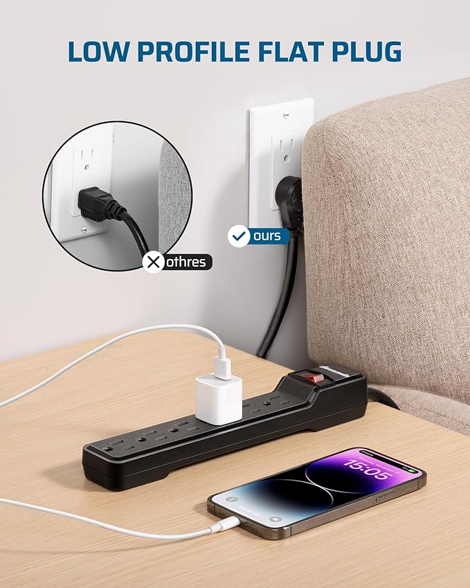 - [Low Profile Flat Plug] With slim flat plug, this surge protector power strip 15 ft cord is designed to fit various usage scenarios, making it ideal for tight spaces behind TV mounts, sofas, nightstands, and headboards, ensures easy placement without obstructing furniture or walls