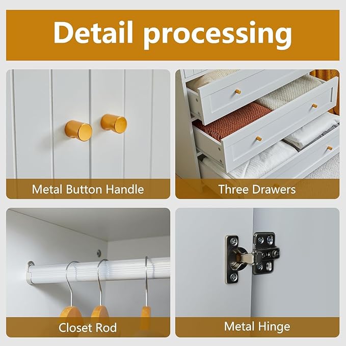 - 【Elegant Style】This wooden wardrobe is simple, it combines white panels with gold handles to create luxury charm.This large wardrobe matches well with various house decors.