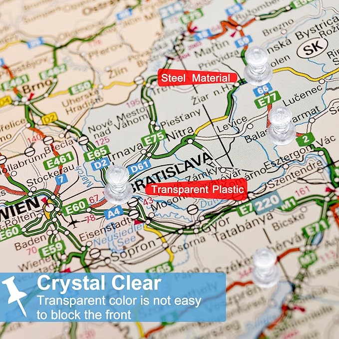 - VERSATILE APPLICATIONS: These clear push pins can be used to pin important documents, papers, photos, etc on bulletin boards, cork boards, wall, posters, memos, calendars. Or to hang small ornaments, mark maps, create beautiful DIY handmade crafts.