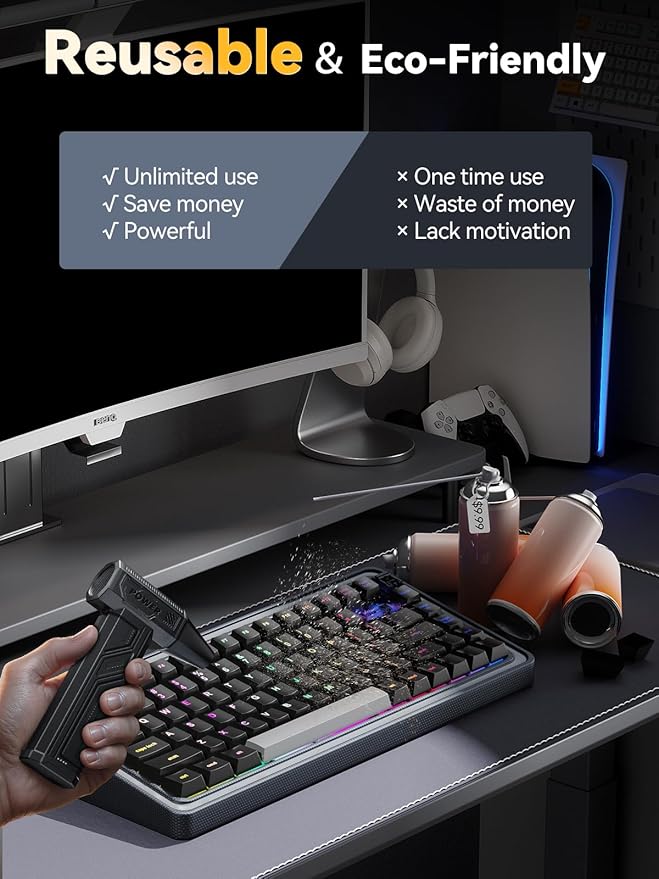 - Eco-Friendly & Cost-Efficient: The compressed air duster is a reusable and sustainable alternative to single-use compressed air cans, offering long-term savings and reducing environmental impact.