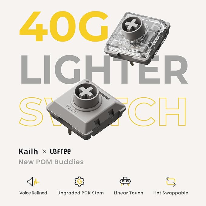 - Specter Full POM Linear Switches: New members of the Lofree and Kailh Low-profile Full POM Switch family, Aiming to soften the touch and reduce muscle strain on wrists with fingers curved naturally, we lower the operating force from 50gf to 40gf, significantly reducing finger joint fatigue during long typing sessions