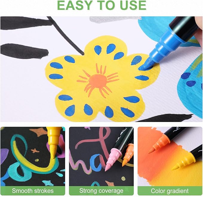 - Versatile Dual Tip: Our acrylic paint markers feature a unique dual-tip design to meet various needs. The 1mm fine tip is perfect for outlining and adding intricate details, while the 1-5mm brush tip is designed for covering large areas.By adjusting brush pressure, you can create different strokes without the hassle of changing nibs, making your creative process more convenient. Whether you're a beginner or a professional, you can fully unleash your creativity!