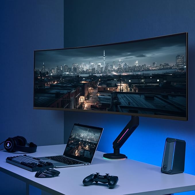 AVLT Single 27”-45” RGB Gaming Monitor Arm Desk Mount Built-in 20 Lighting Modes Touch Button Control Fits Flat/Curved/Ultrawide Screen Height Swivel Tilt Rotation Adjustable Stand -Black