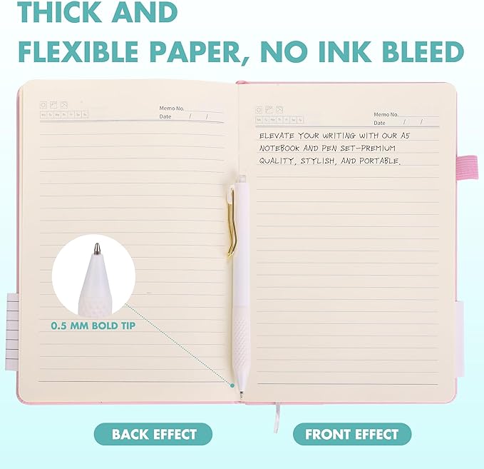 - Quality leather & paper: our A5 notebooks are made of 100 gsm thick paper, providing a smooth touch and resisting ghosting and bleeding, compatible with most pens, pencils and markers; the lined journal notebook with pens feature premium PU leather hardcover, waterproof and easy to clean, helping the notebooks stay upright without the pages curling or bending; the ballpoint pen is designed with a 0.5 mm bold tip for smooth, non-leaking drawing, ideal for use with the journal